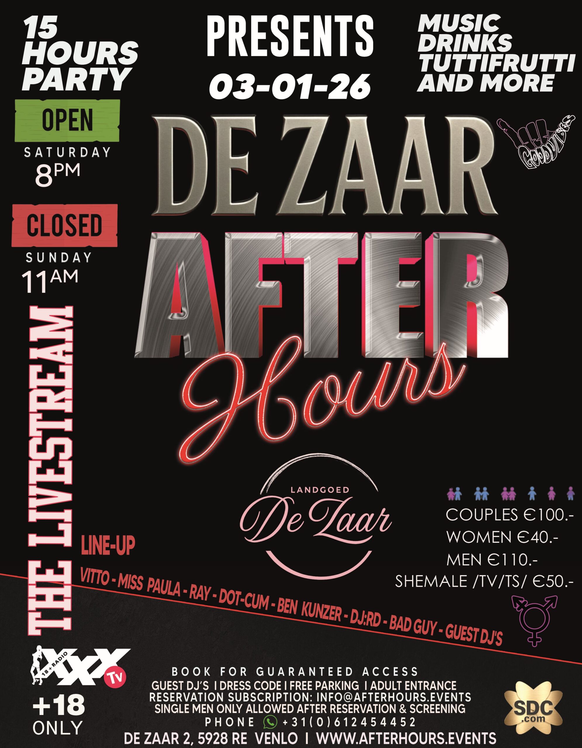 🎟️ Tickets WhatsApp Phone +31(0)612454452 RESERVATION SUBSCRIPtION: info@afterhours.events De Nieuwjaars party 31-12-25 THE XXXRADIO LIVESTREAM 🎉🎊 Erotische party met special Guest DJ"s Welkom bij Parenclub landgoed "De Zaar" Party Time start 20:00 * Till late 01-01-26 free drinks, guest dj's, dress code, free parking, adult entrance 🎟️Couples Є100.- 🎟️Women Є40.- 🎟️Male Є110.- 🎟️Shemale /Tv/Ts/ Є50.- Single men only allowed after reservation & screening De Zaar 2, 5928 RE VENLO
